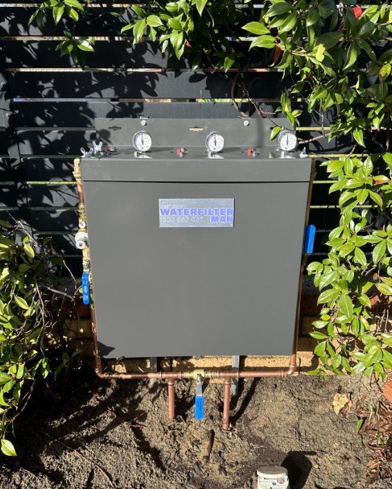Our very own designed & made, West Coast Water Filter Man whole of house triple water filtration system. The triple filter system will be encased in a powder coated steel case for protection from the harsh Australian elements.
